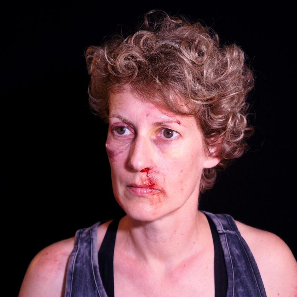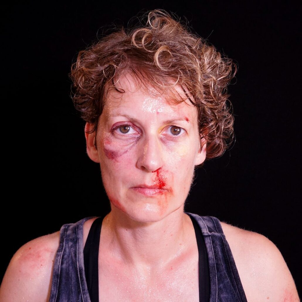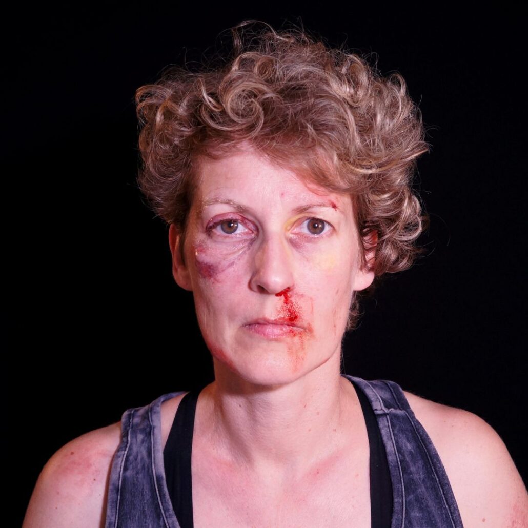 Voeg een subtiele bloedneus toe en eventueel een klein sneetje bij de wenkbrauw. Gebruik realistisch nep bloed dat veilig rondom de mond is.