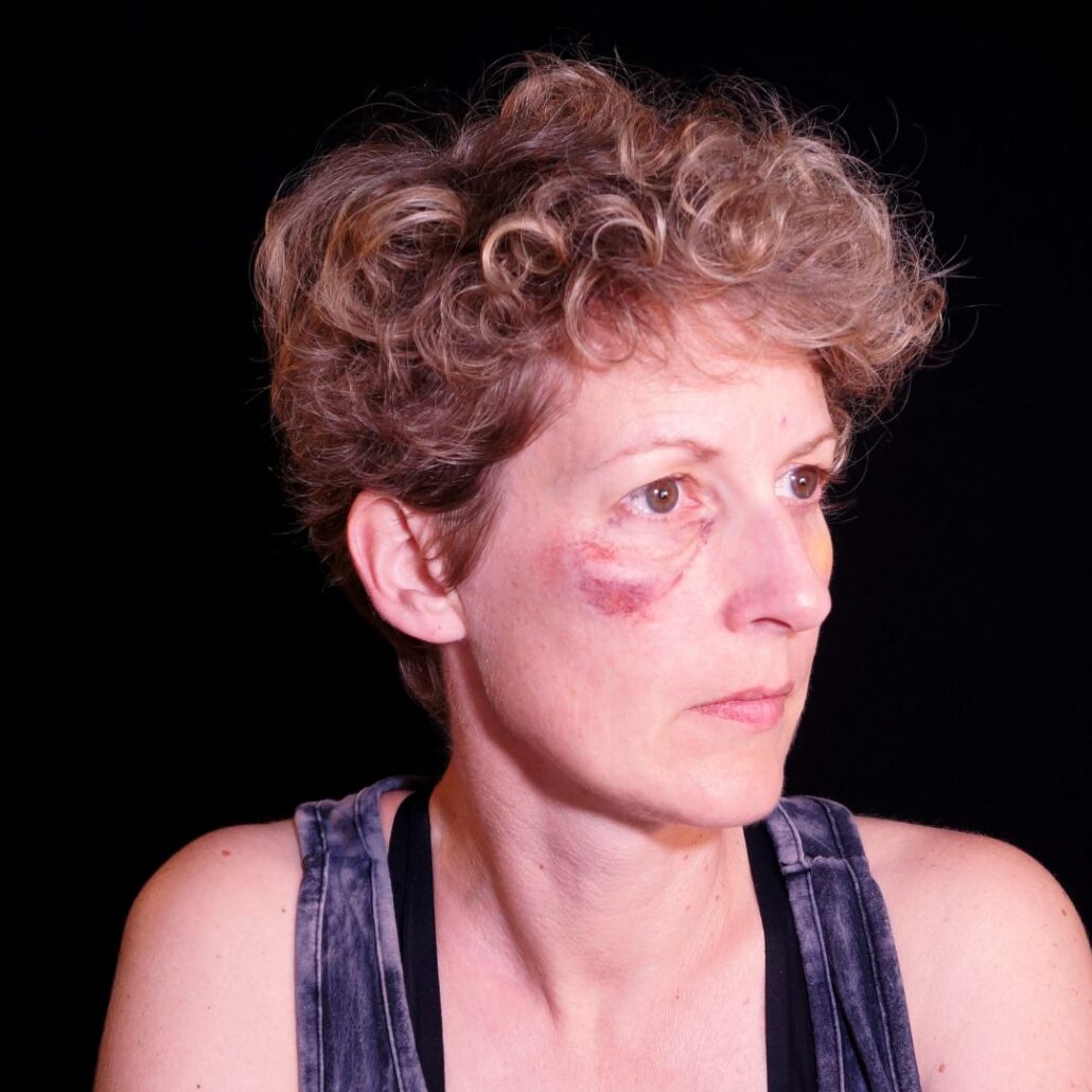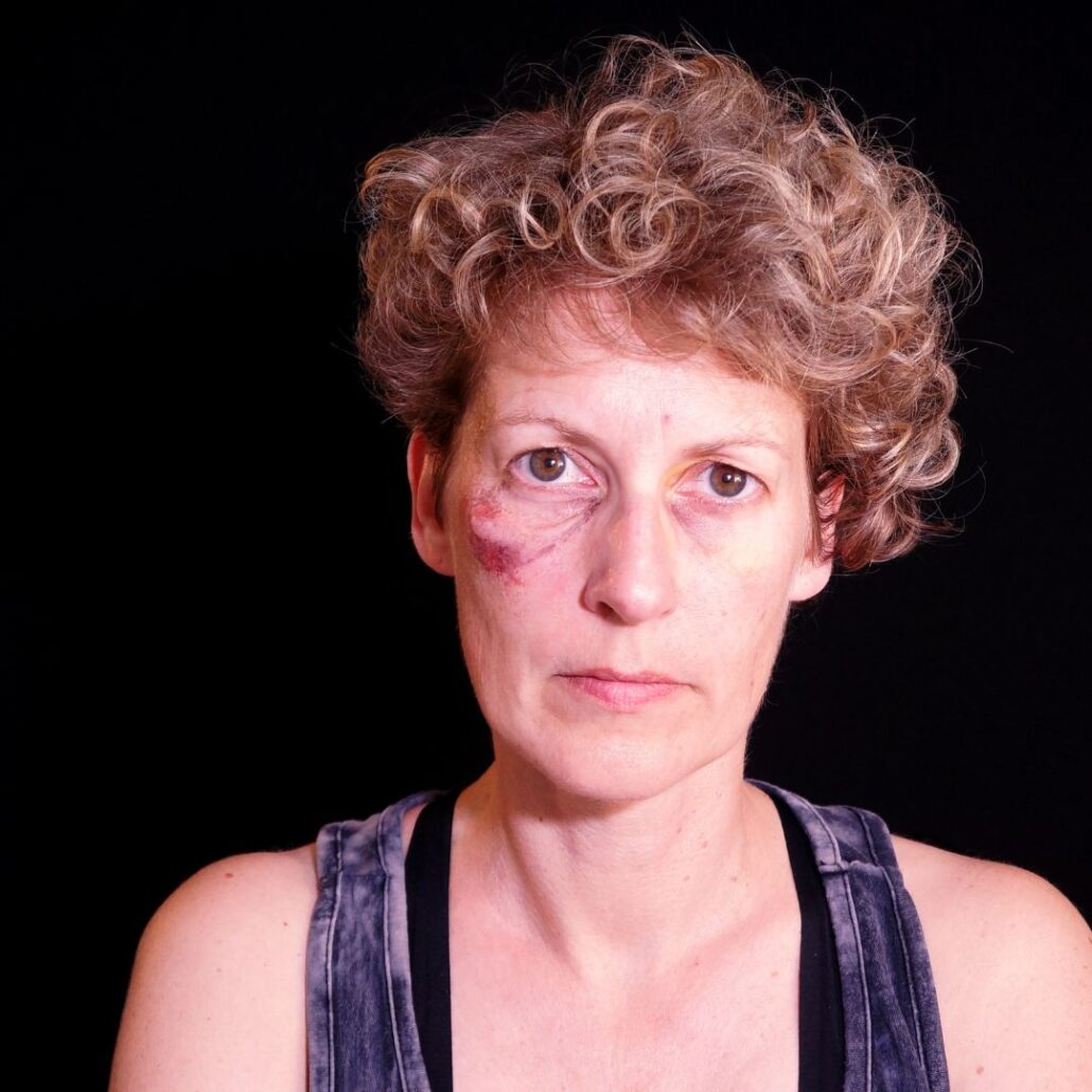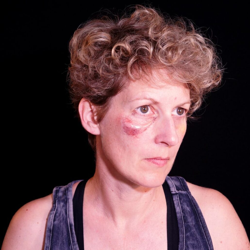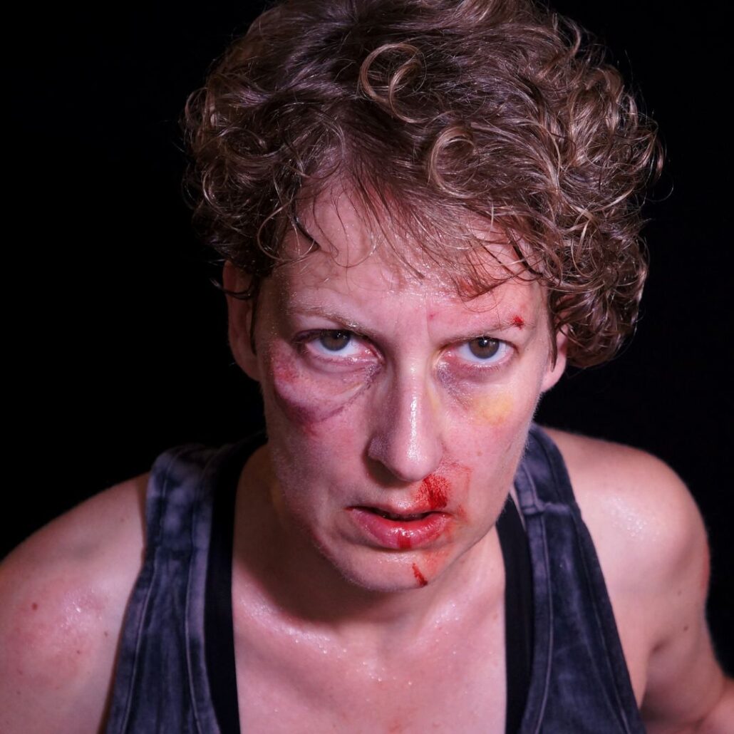 Voeg een subtiele bloedneus toe en eventueel een klein sneetje bij de wenkbrauw. Gebruik realistisch nep bloed dat veilig rondom de mond is.