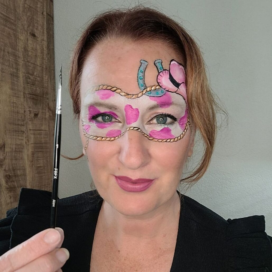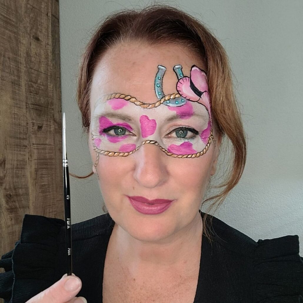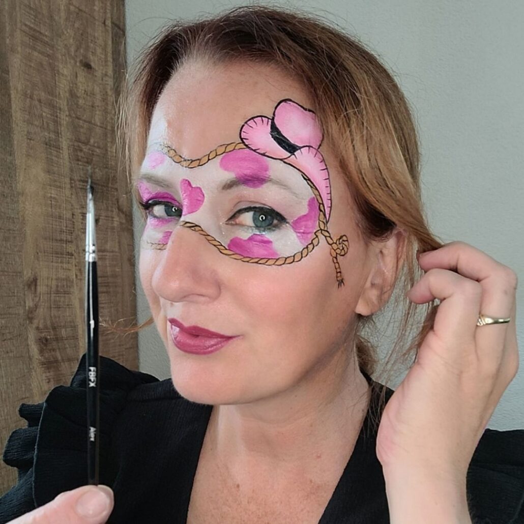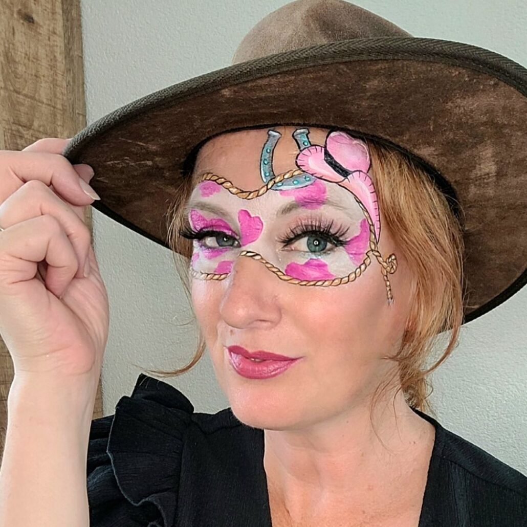 Wie heeft er vroeger niet cowboys en indianen gespeeld? Met dit cowboy schmink ontwerp speciaal voor meiden breng je die fantasie meteen tot leven. Het is stoer dankzij de lasso en cowboyhoed, vrolijk door de roze kleuraccenten en speelse koeienvlekken, én sprankelend door de glans en highlights.