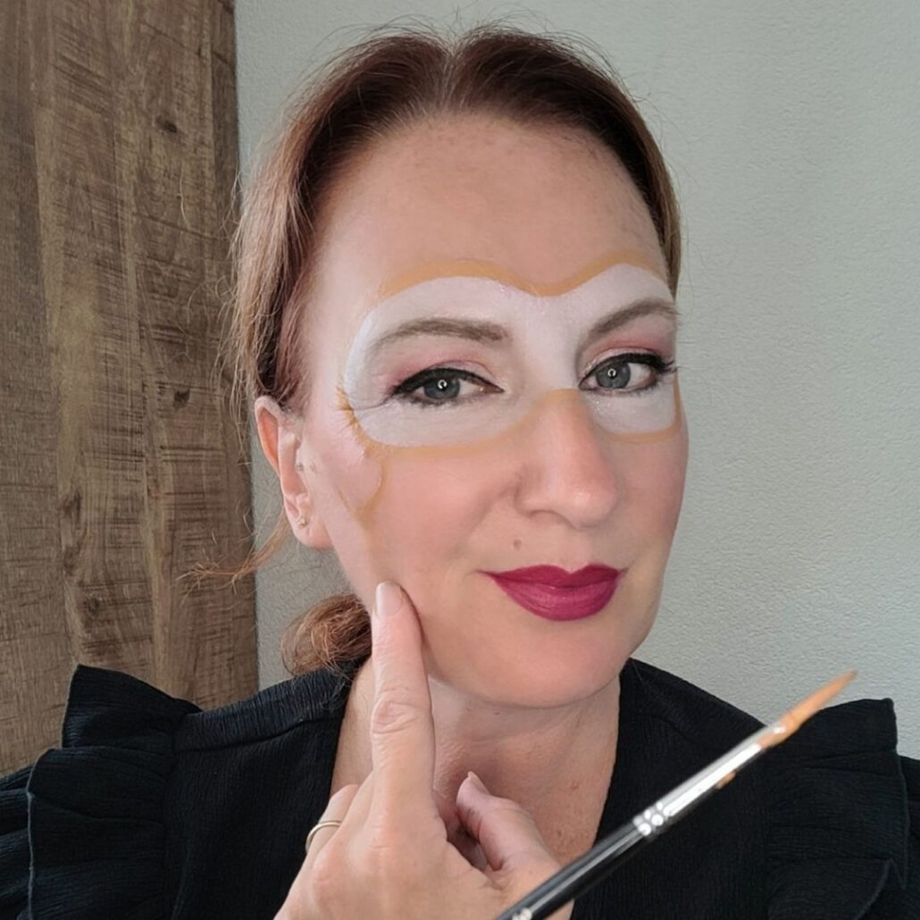 Daarna omlijn je het masker met beige schmink om een lasso-effect te maken. Gebruik hiervoor een ronde (Linda) penseel nr. 3. Bovendien voeg je aan beide kanten speelse uiteindes toe, waardoor het lijkt alsof de lasso net is gegooid.