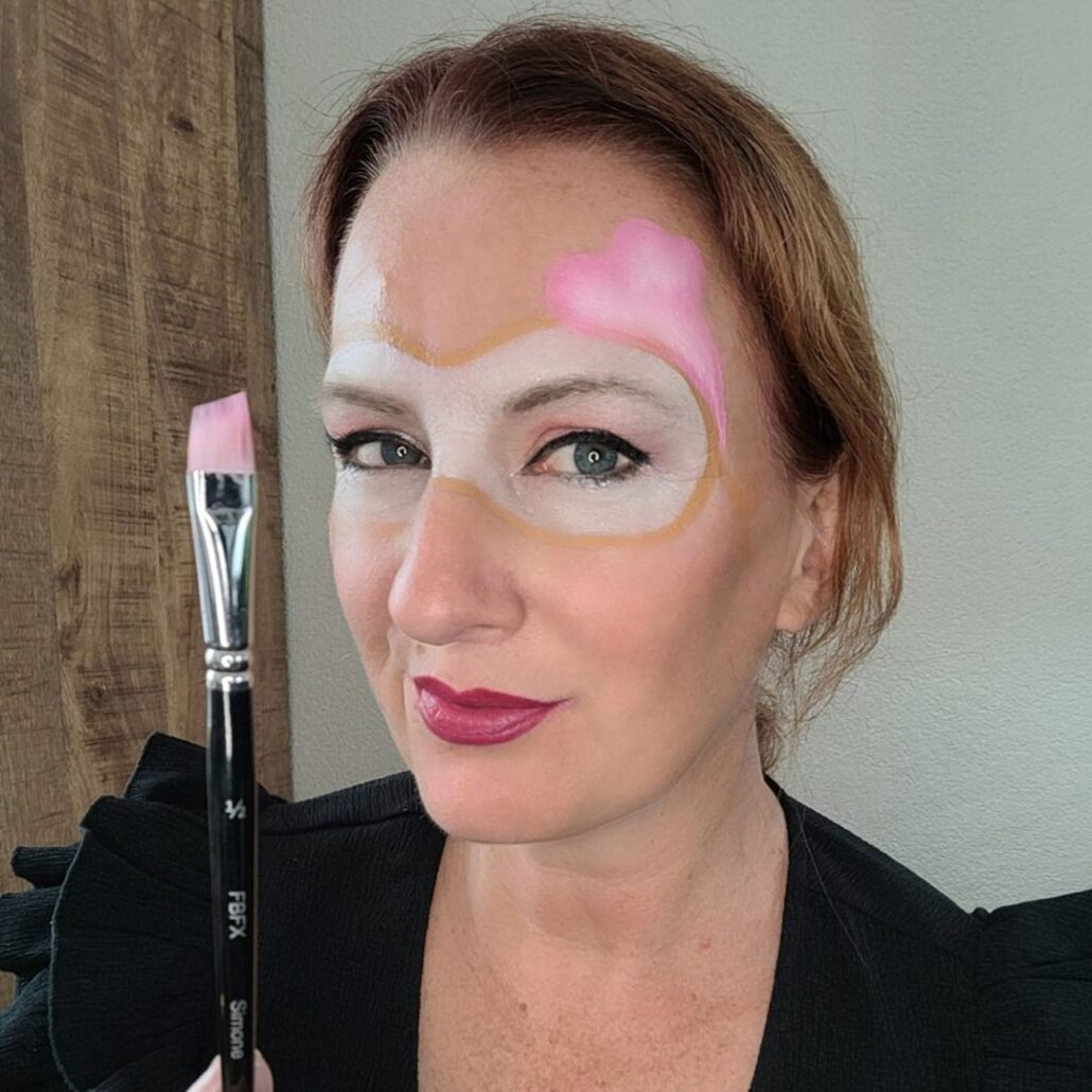 Vervolgens ga je aan de slag met de hoed, want geen cowboylook is compleet zonder. Voor deze meidenversie maken we een roze hoed met een splitcake en een angled (Simone) penseel ½. Zorg dat de donkere kleur aan de buitenkant zit. Eerst teken je een grote druppelvorm tegen het masker (onderkant hoed) en daarna twee boogjes voor de bovenkant.