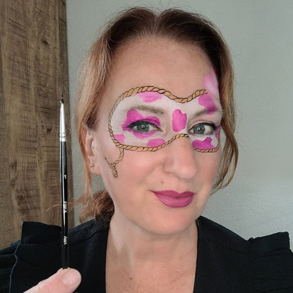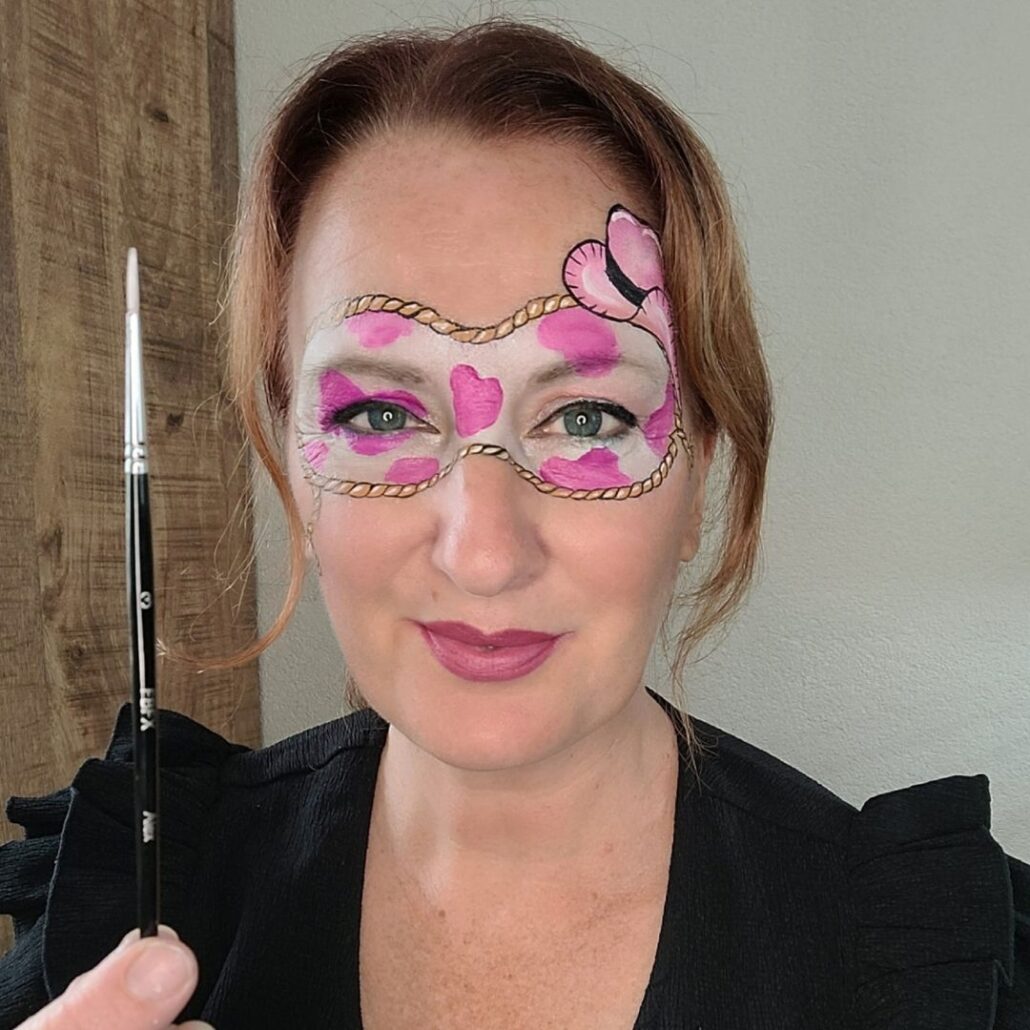 Nu voeg je een extra speels detail toe: koeienvlekken in het masker. In dit ontwerp zijn ze roze, gemaakt met een filbert (Jerry) penseel ¼. Varieer in grootte, zodat het geheel levendig oogt.