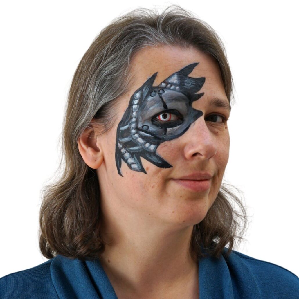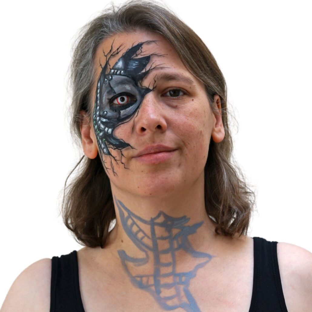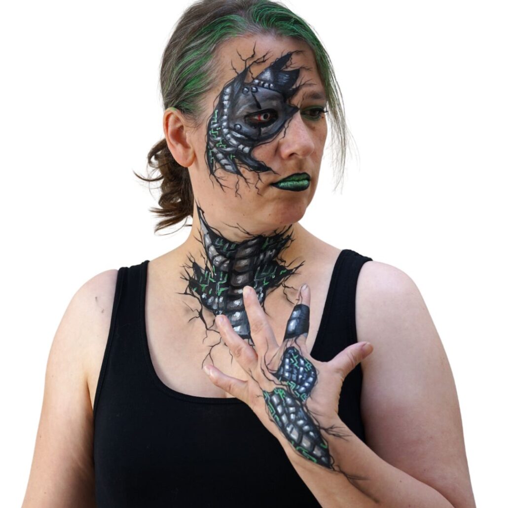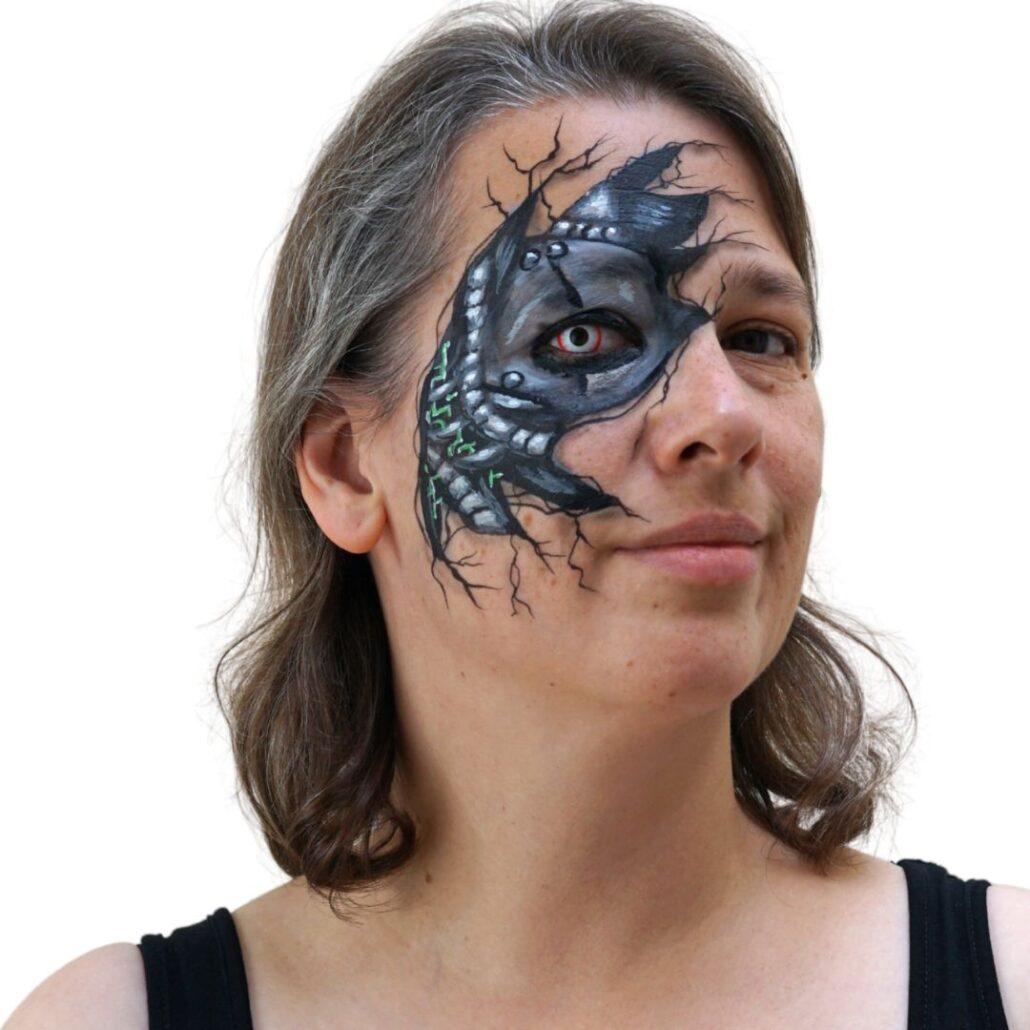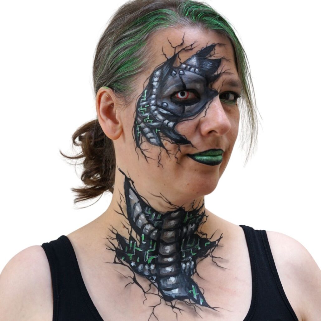 Of je nu alleen het gezicht doet of de hele nek en arm meeneemt: met deze Cyborg Makeup steel je zeker de show. Het is een stoere, moderne look die krachtig oogt, maar verrassend makkelijk te maken is.