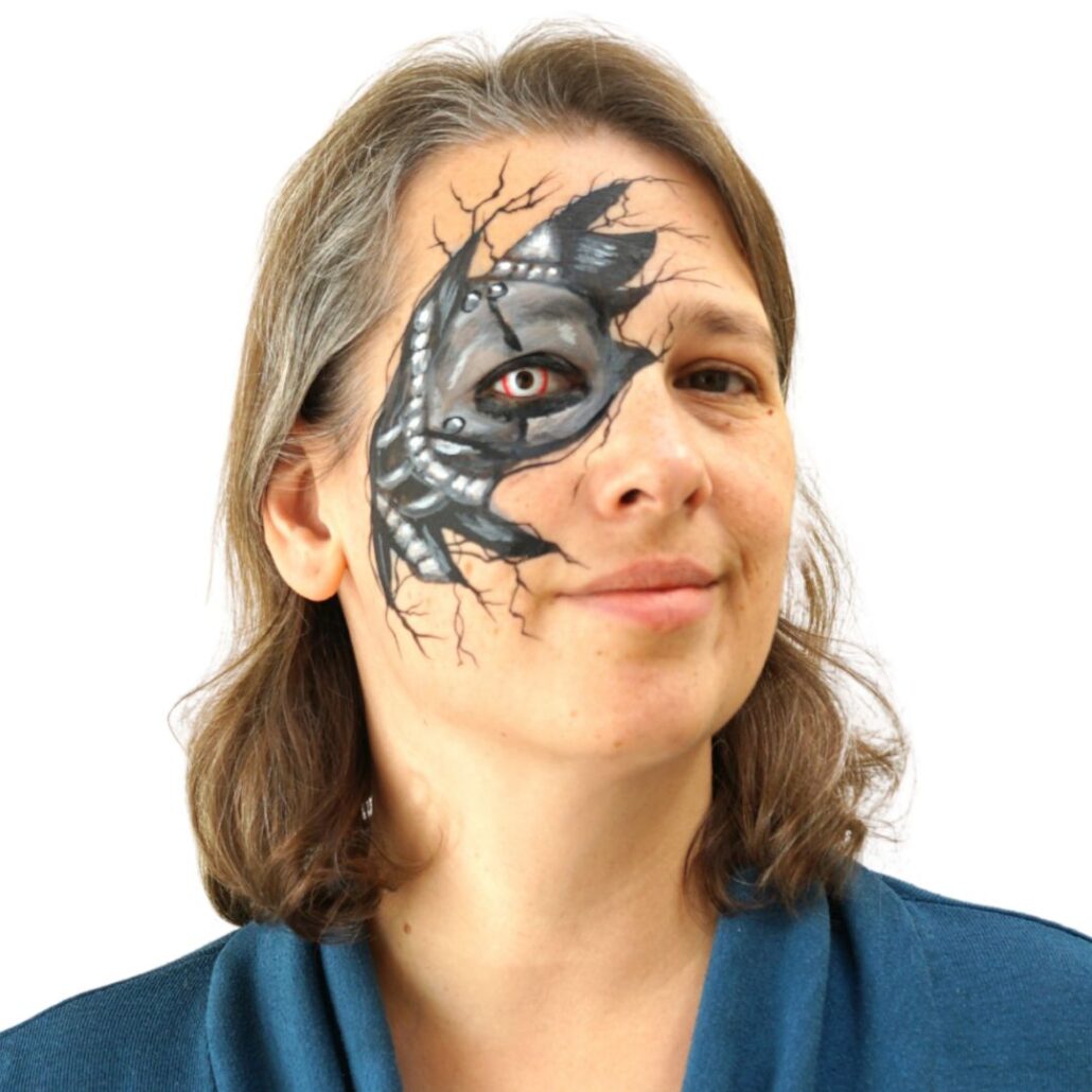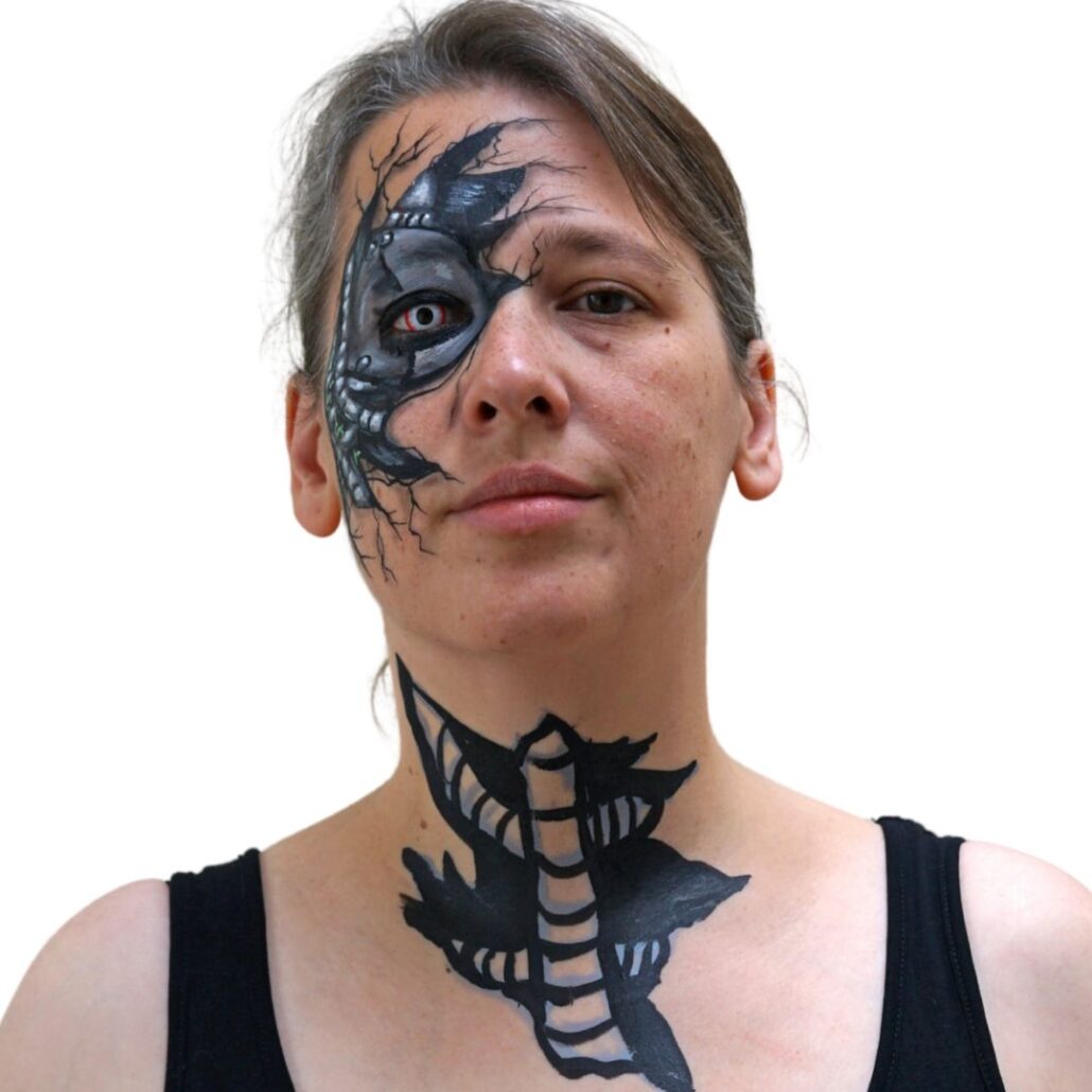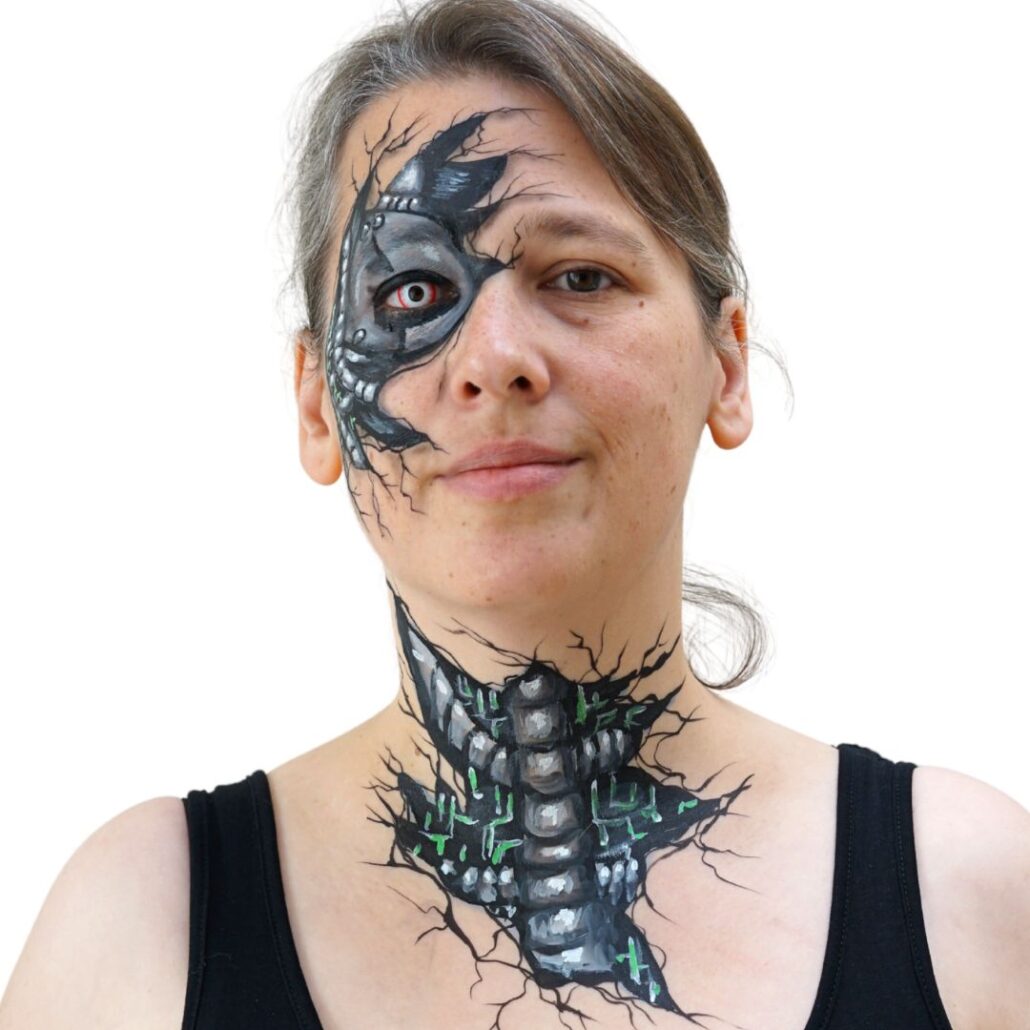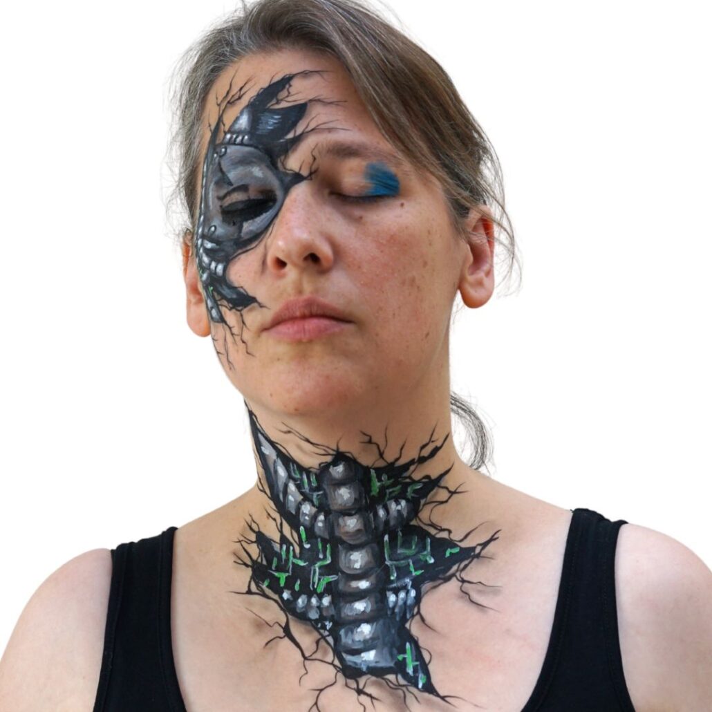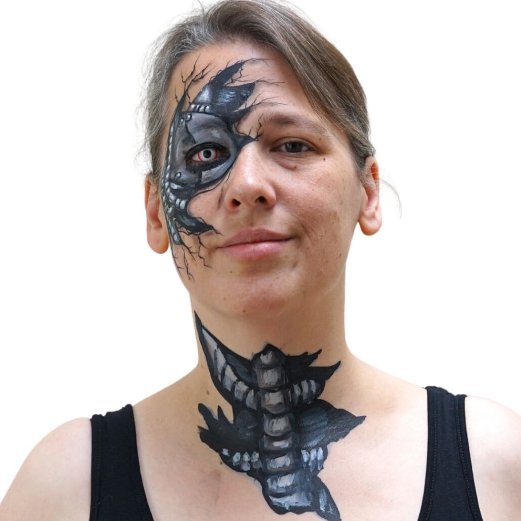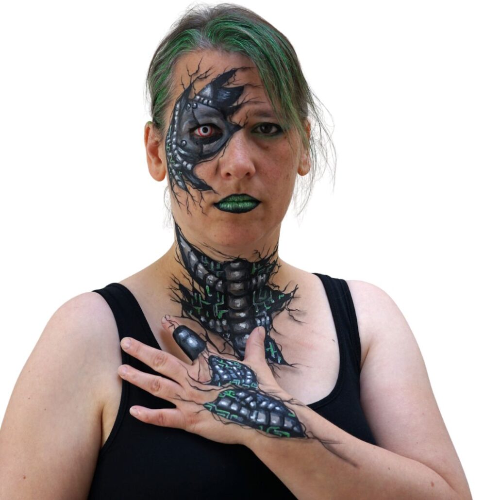Of je nu alleen het gezicht doet of de hele nek en arm meeneemt: met deze Cyborg Makeup steel je zeker de show. Het is een stoere, moderne look die krachtig oogt, maar verrassend makkelijk te maken is.