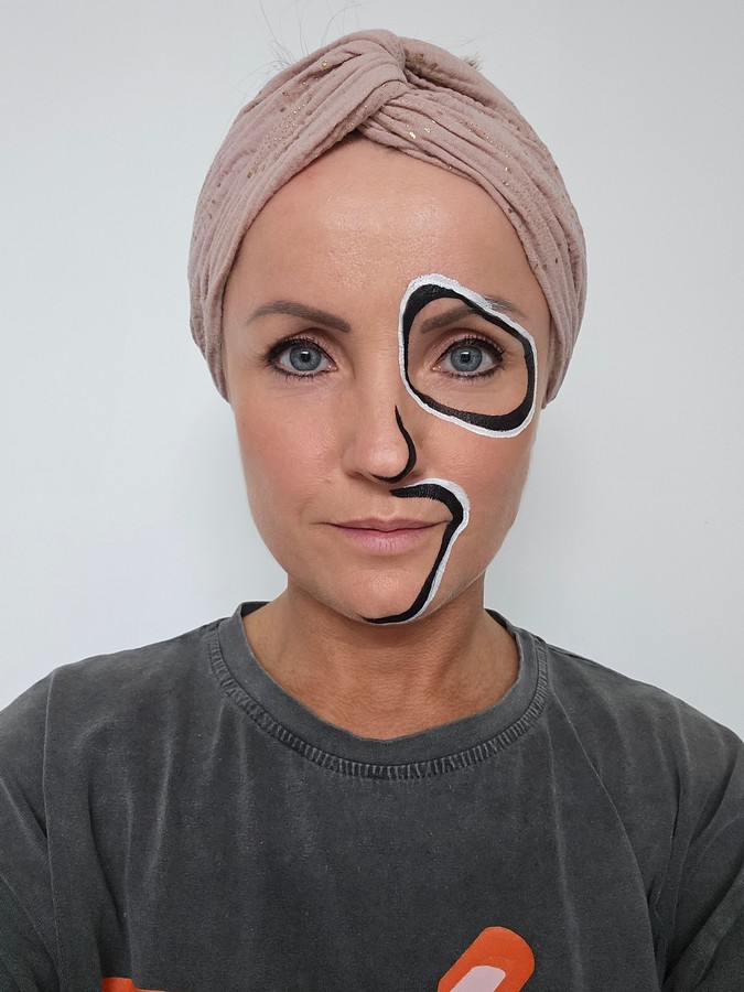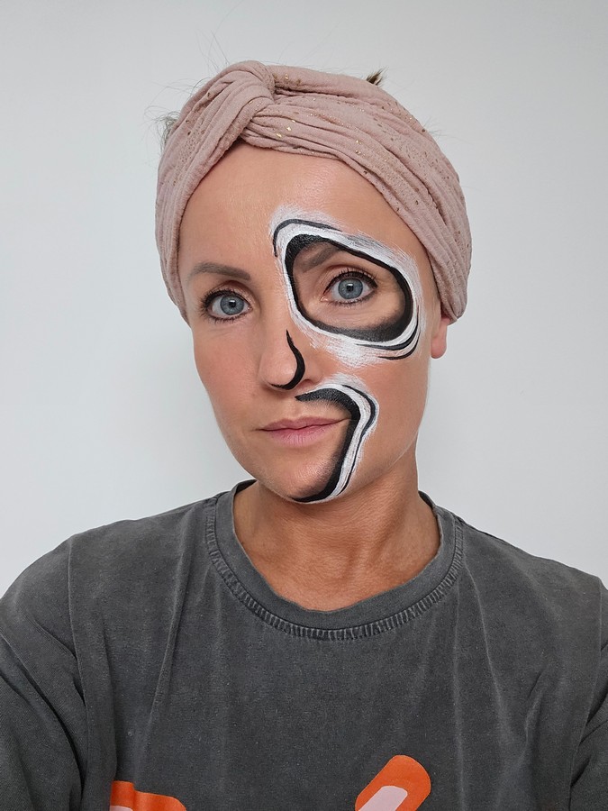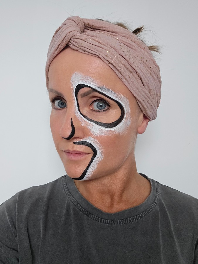 Gebruik daarna hetzelfde penseel met Diamond FX Essential White en trek witte lijnen naast de zwarte — vooral rondom de ogen en mond. Zo creëer je het kenmerkende maskereffect van Ghostface.