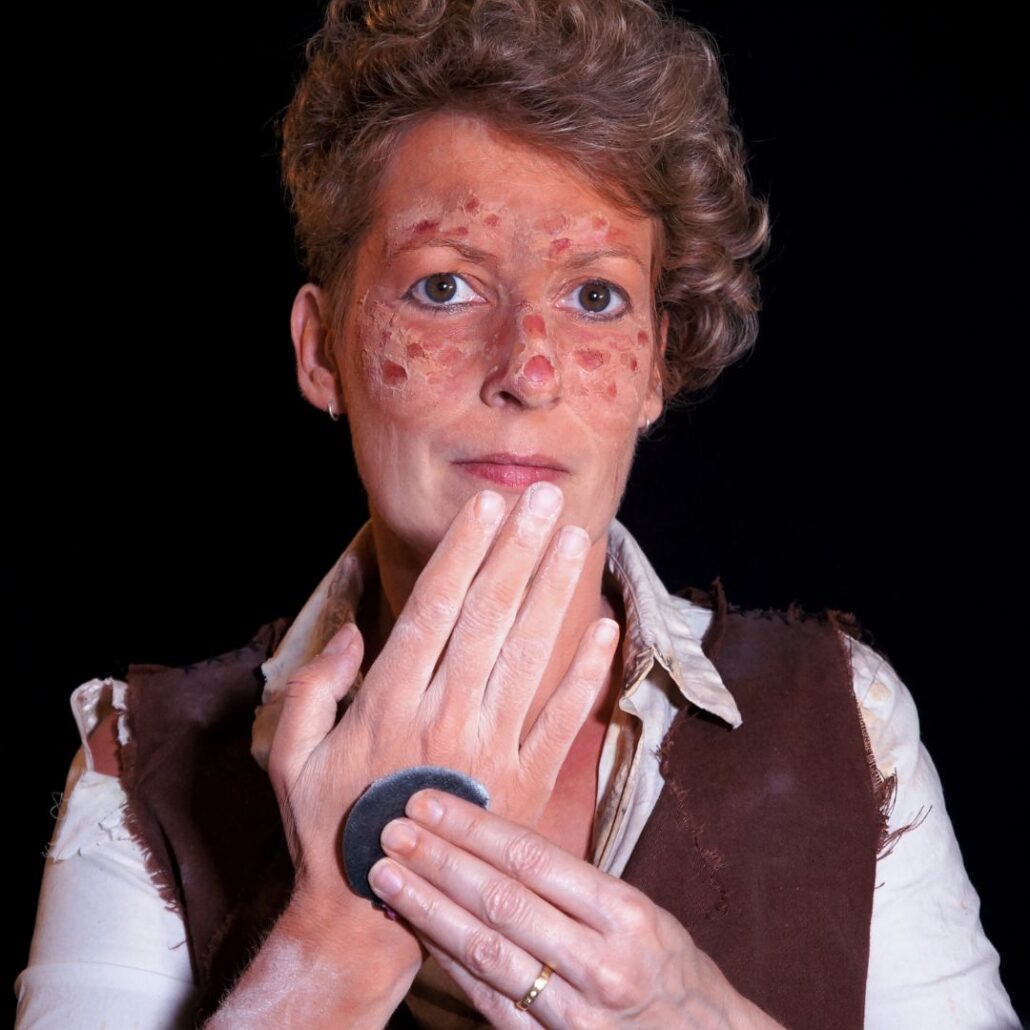 Als de latex droog en plakkerig is, peuter je het voorzichtig open en rol of vouw kleine stukjes terug. Dankzij de schmink eronder lijken dit echte vervellende blaren. Poeder pas af wanneer je tevreden bent.