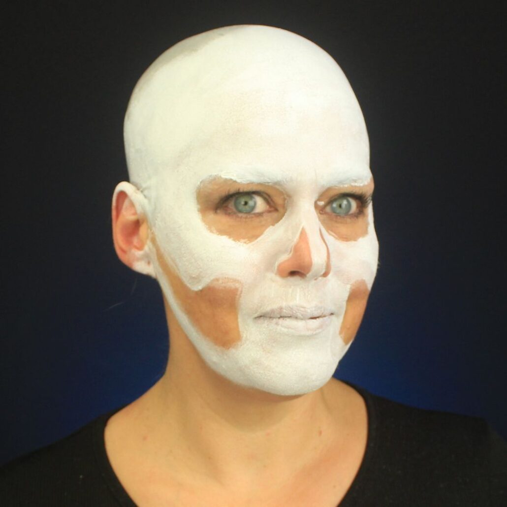 Voor deze Halloween Skull begin je met een kaal canvas. Daarom breng ik eerst een Grimas Kaalkop (Bald Cap) aan. Hiermee werk je je eigen haar volledig weg en krijgt de skull-look meteen veel meer impact.