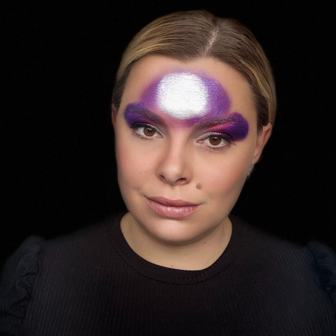 Gebruik een petal spons om Superstar Special Lavender, Cyclamen en Silverwhite with Glitter aan te brengen rond de ogen en over het voorhoofd.