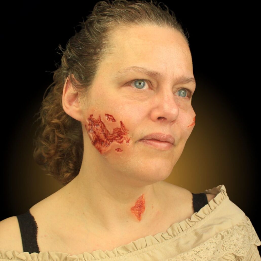 💡 Tip: werk in dunne laagjes en varieer in kleur. Een mix van donkerrood, roestbruin en zelfs een vleugje paars maakt de wonden geloofwaardiger en geeft ze meer diepte.