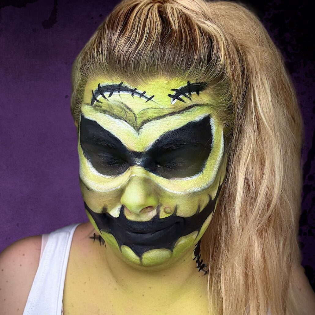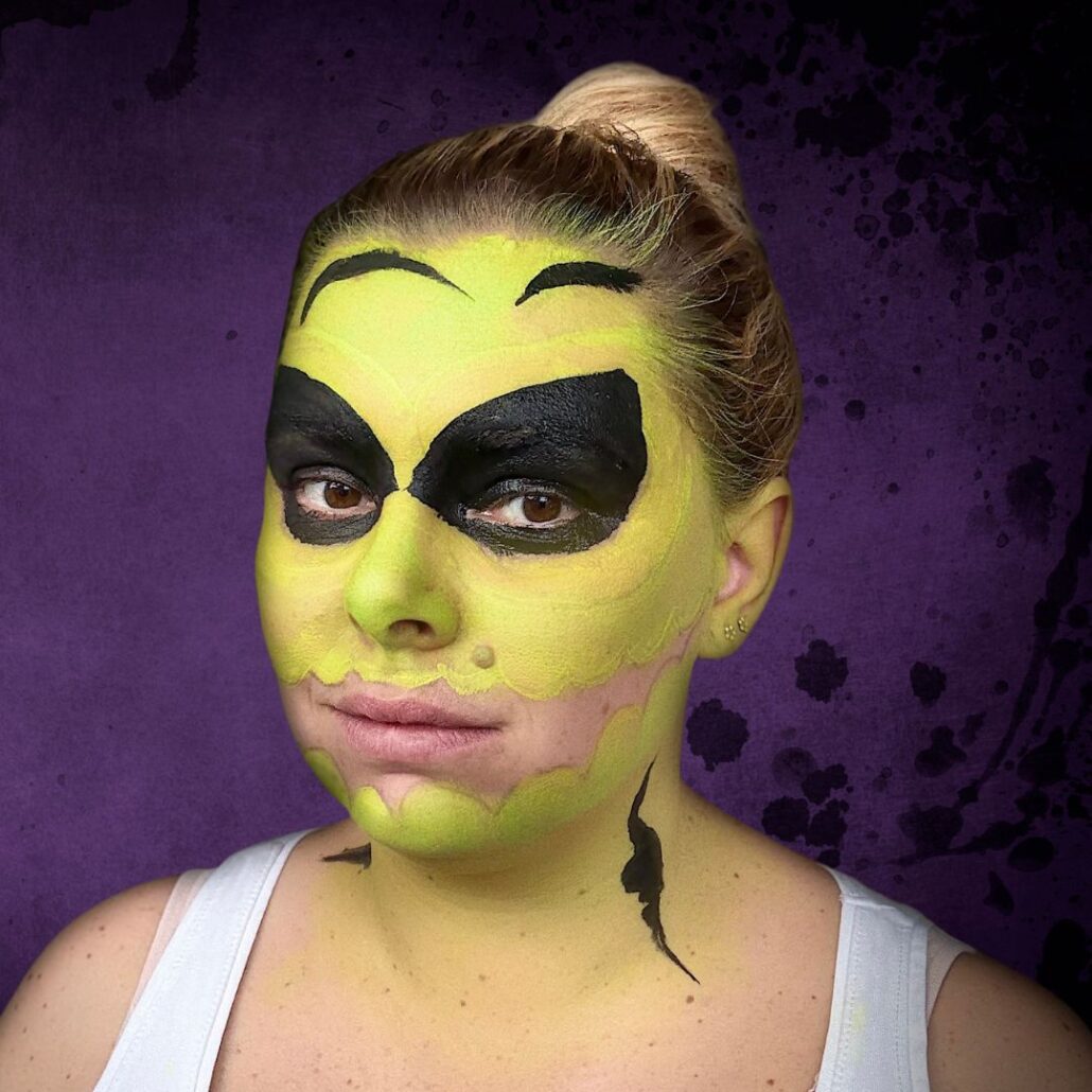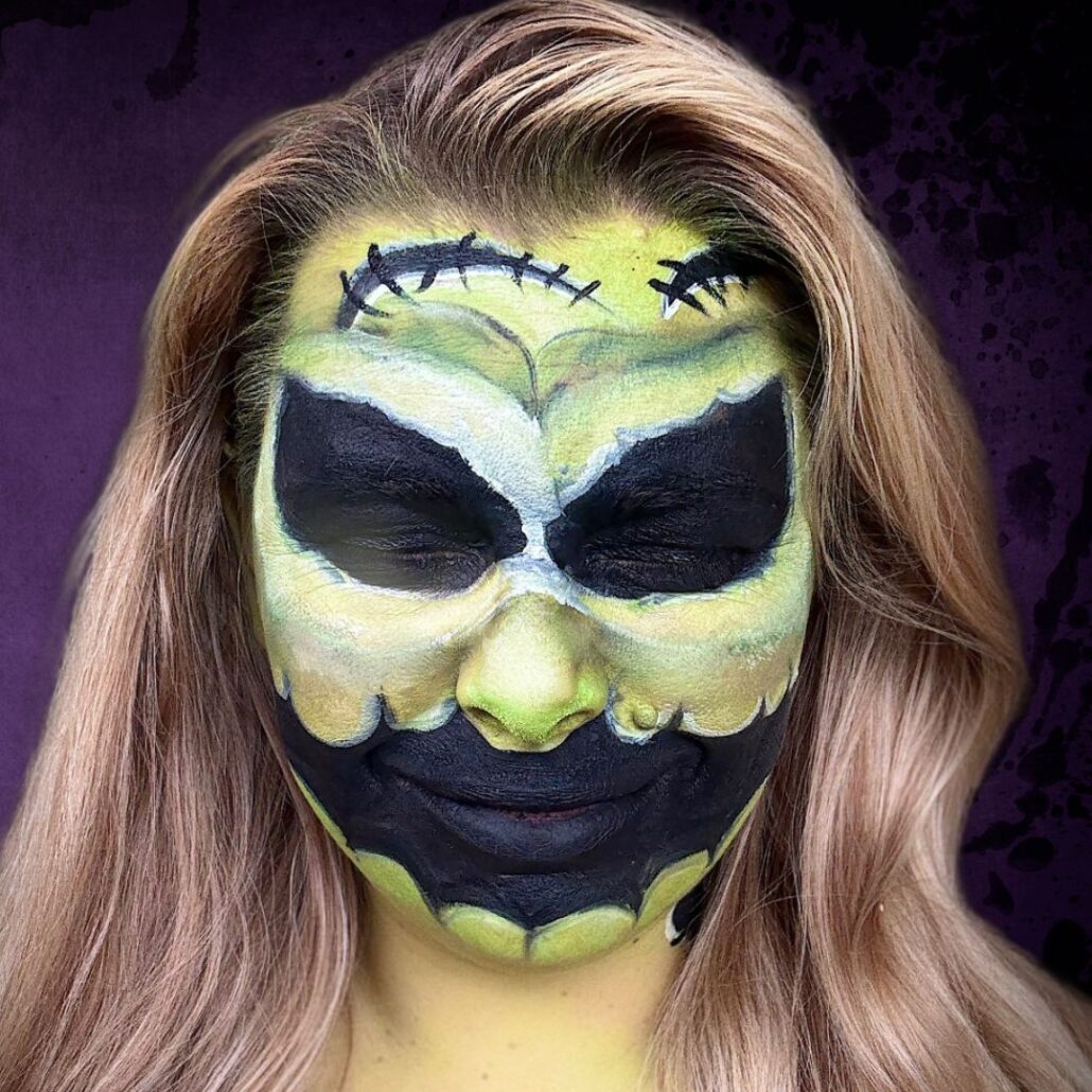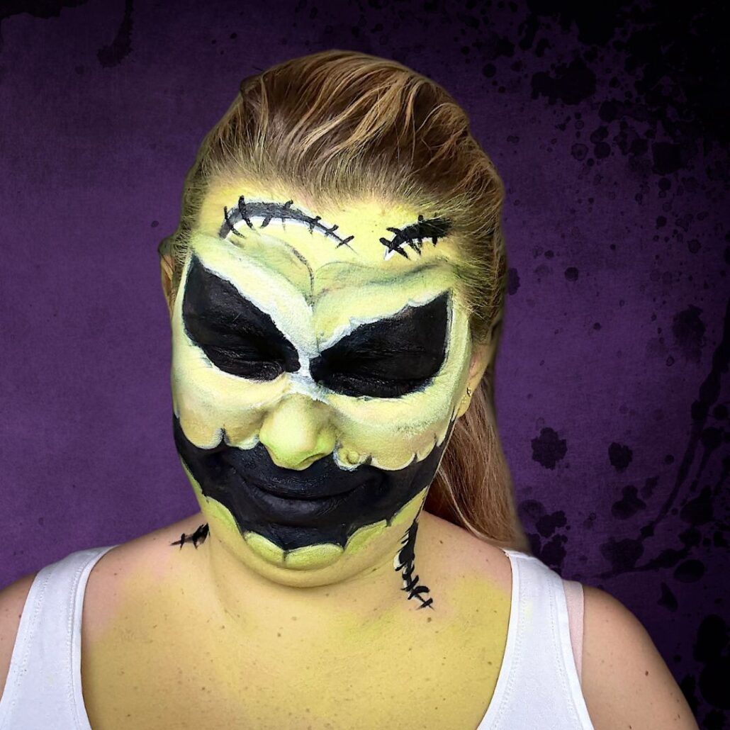 Wil je de Oogie Boogie look doortrekken tot in je nek of schouders? Gebruik dan dezelfde groene basiskleur en voeg wat zwarte steken toe voor een nog intenser effect.