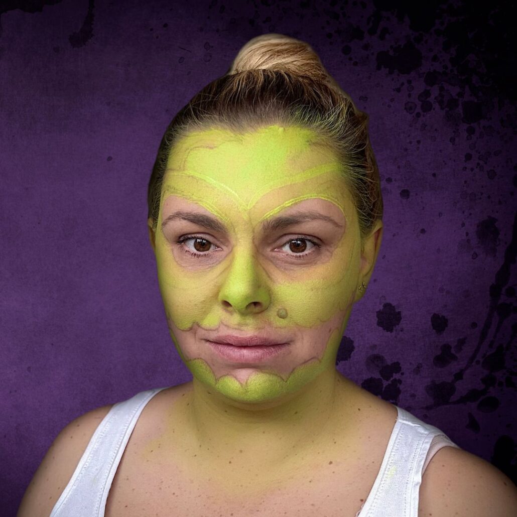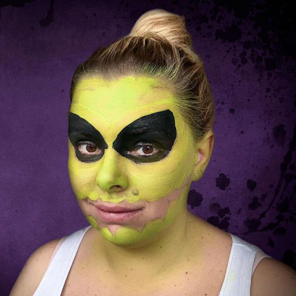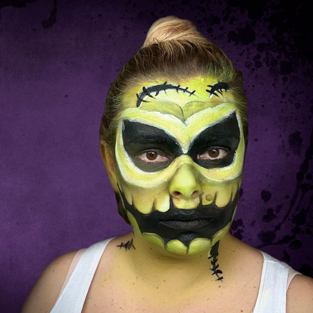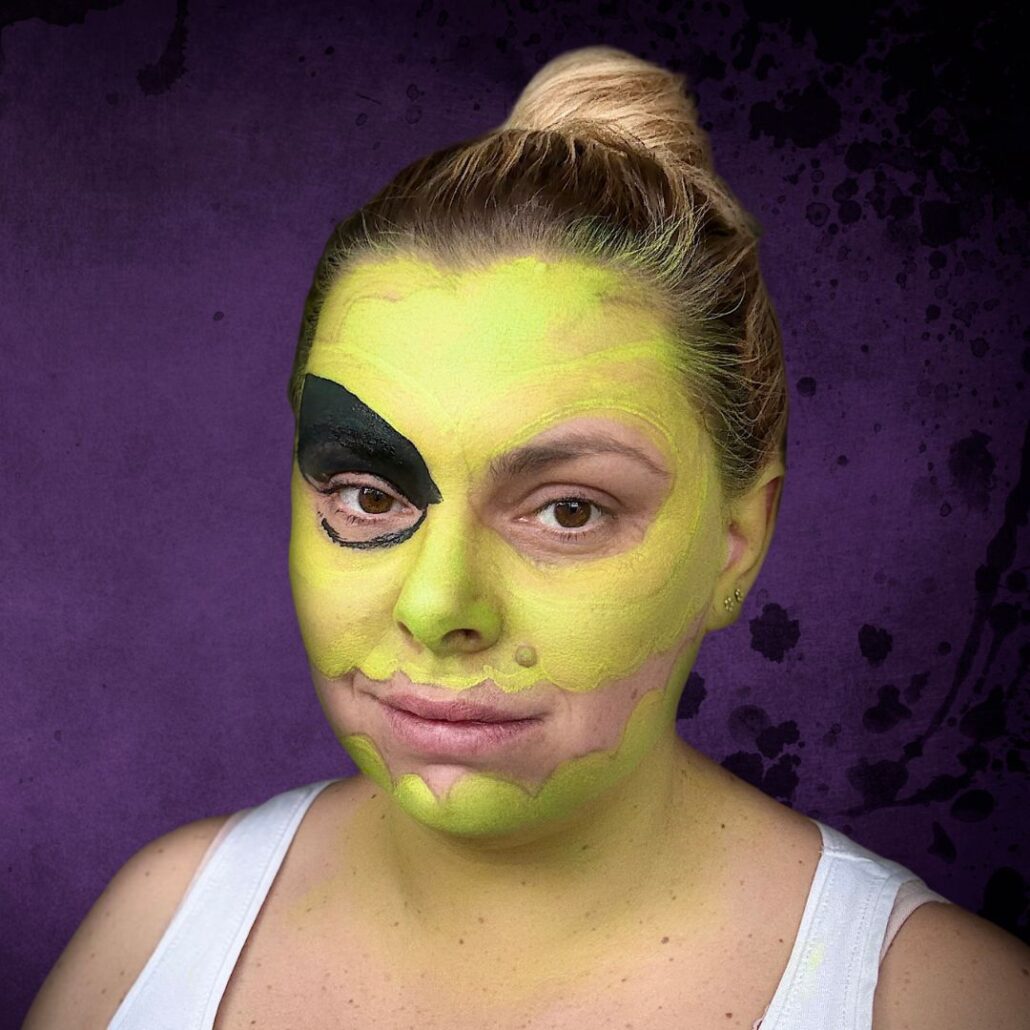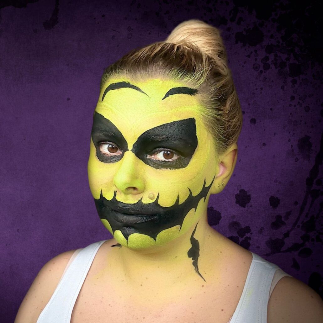 Wil je de Oogie Boogie look doortrekken tot in je nek of schouders? Gebruik dan dezelfde groene basiskleur en voeg wat zwarte steken toe voor een nog intenser effect.