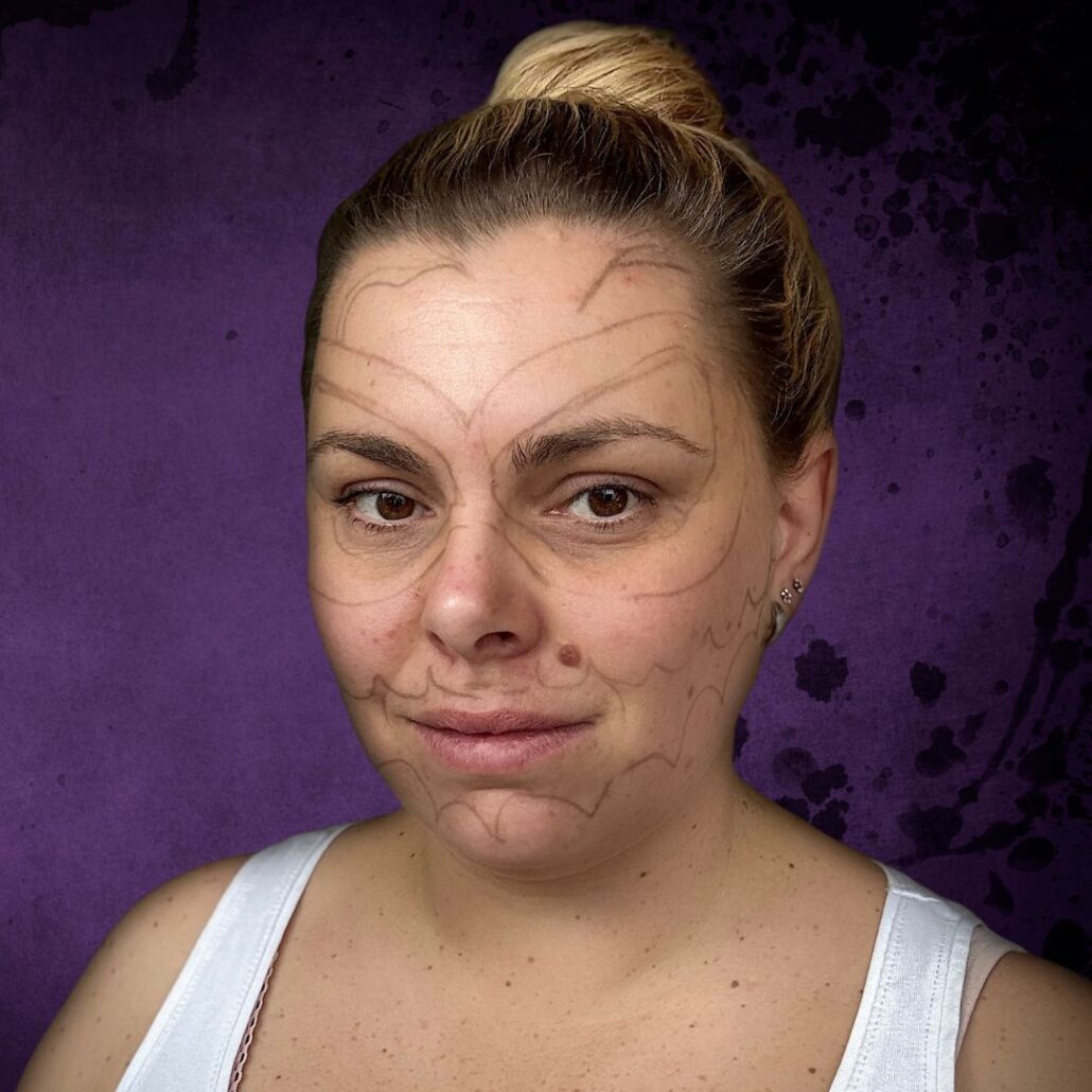 Gebruik een wenkbrauwpotlood om de grote vormen te schetsen — de oogkassen, mondvorm en de boze plooien op het voorhoofd. Zo zie je direct hoe je look straks zal lopen.