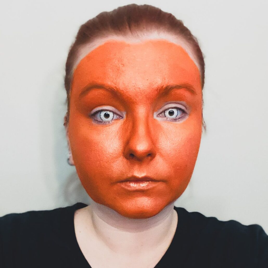 Gebruik het Superstar Matteo Filbert Penseel #6 om het gezicht volledig oranje te schminken met Superstar Tiger (shimmer). Deze tint heeft een lichte glans en vormt de ideale basis voor je pompoen look.