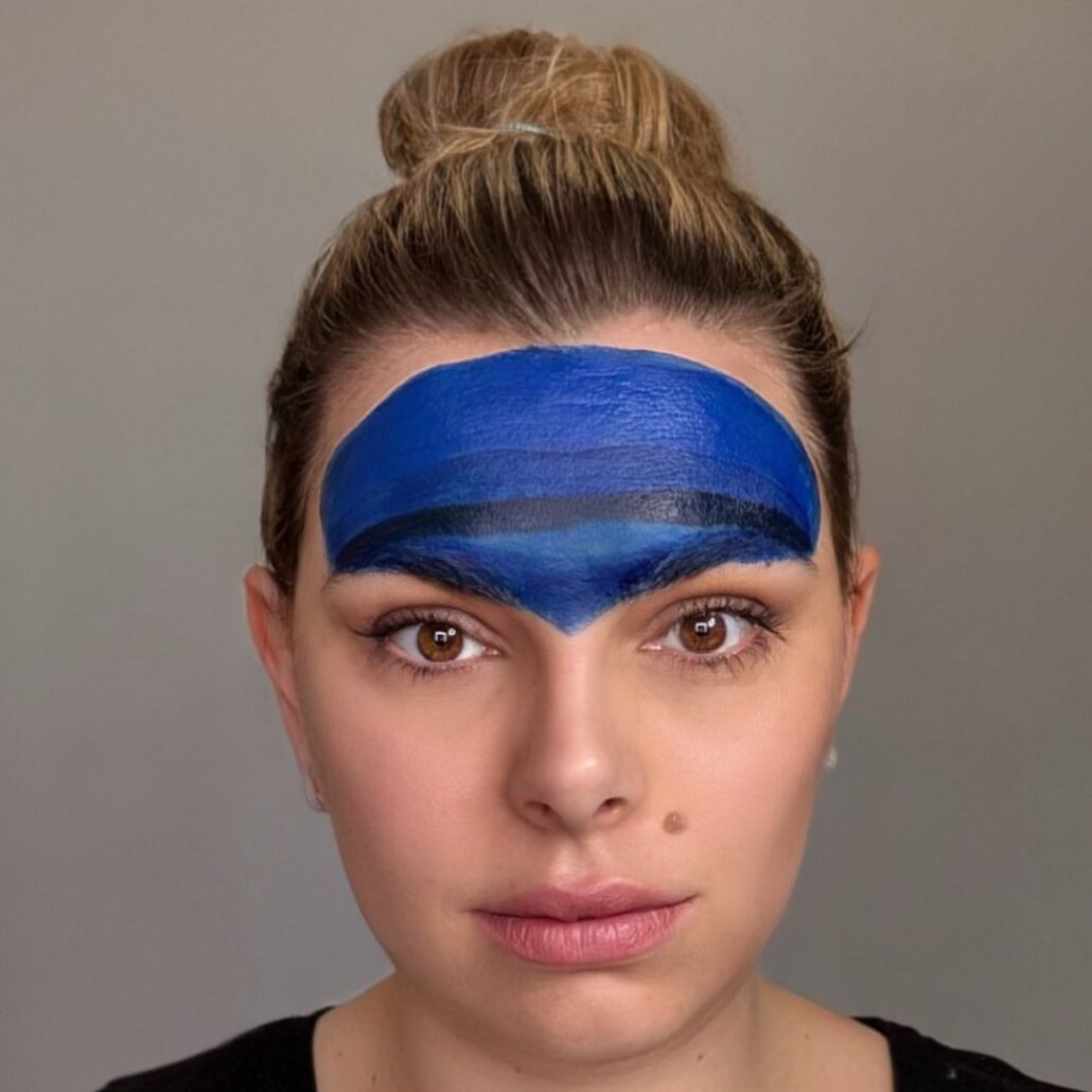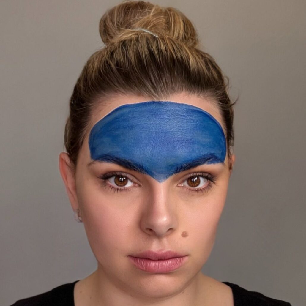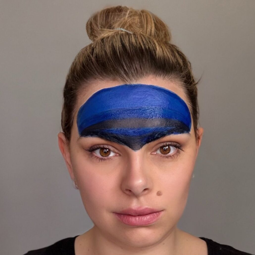 Gebruik de brede FBFX Simone 1” penseel met Superstar Schmink Cobalt (114) en schilder een ronde vorm over het voorhoofd. Dit wordt de basis van de politiepet.