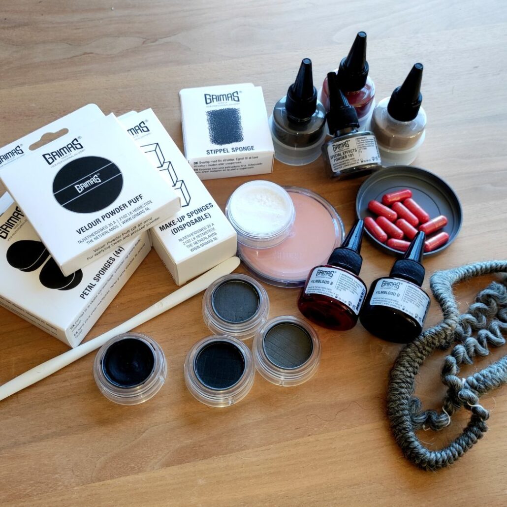 - De bijl en pruik bewerkte ze met Filmblood D en powders; wolcrepe in de vlechtjes geeft een gemêleerde haarkleur.