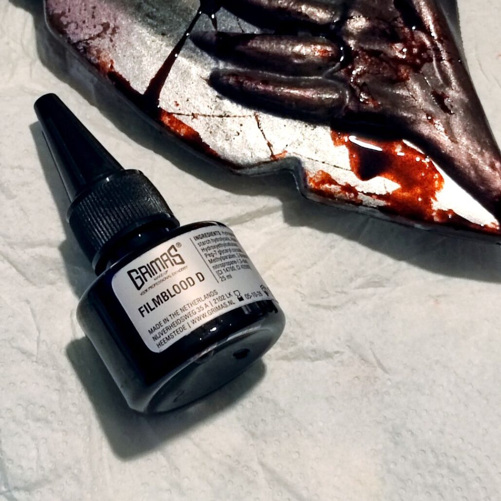 Breng eerst Filmbloed D (donker) in de diepte van verwondingen aan en daarna Filmbloed B (lichter) voor een vers, nat effect. Gebruik een penseel voor precisie en de stipple sponge voor spetters en vegen — zo creëer je realistische bloedsporen en vegen.