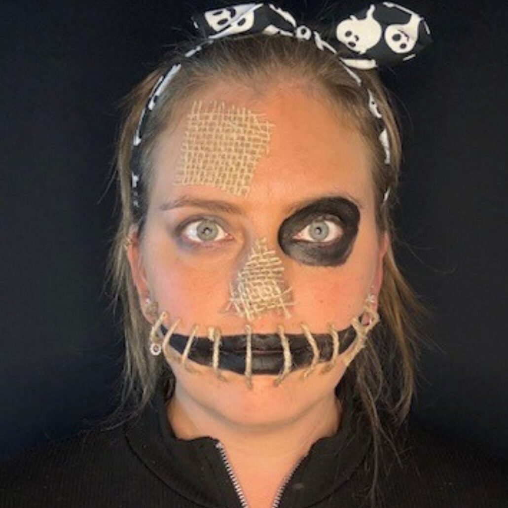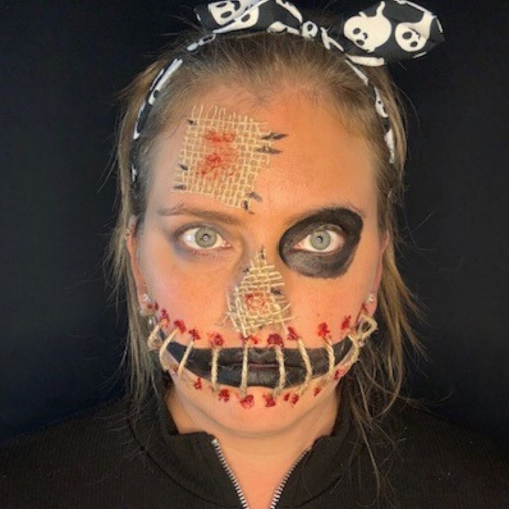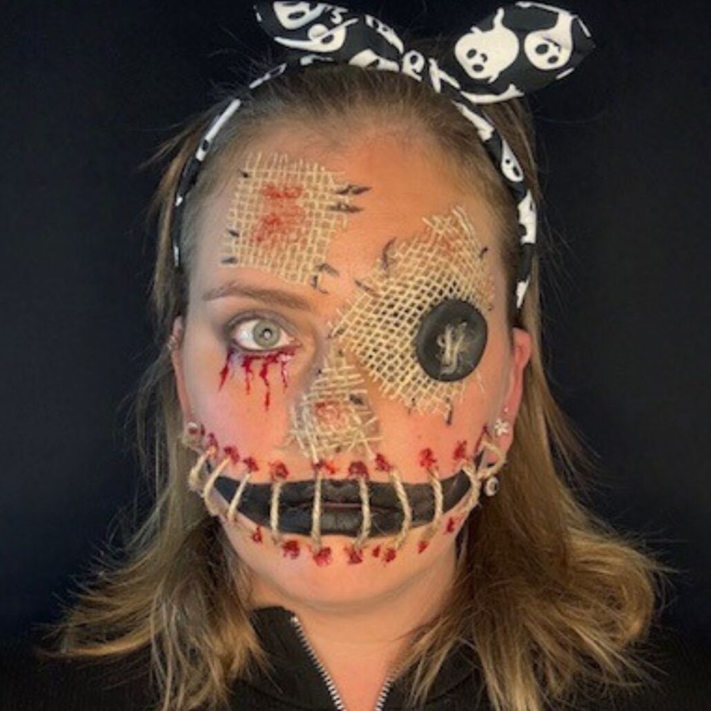 Het resultaat is een angstaanjagende vogelverschrikker met een dichtgestikte mond, bloederige details en een knoop-oog. Ideaal voor Halloween of elk griezelfeest. Durf jij deze look zelf te proberen?