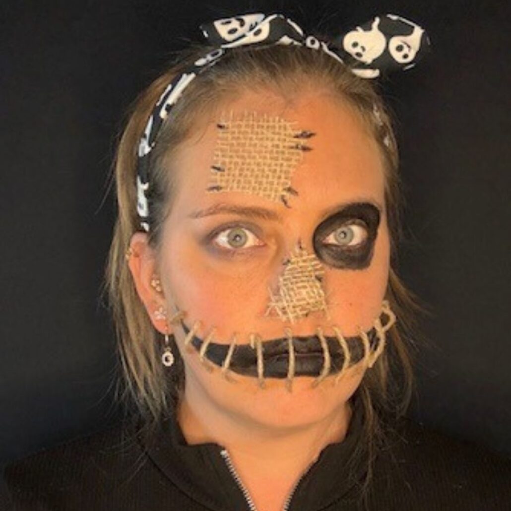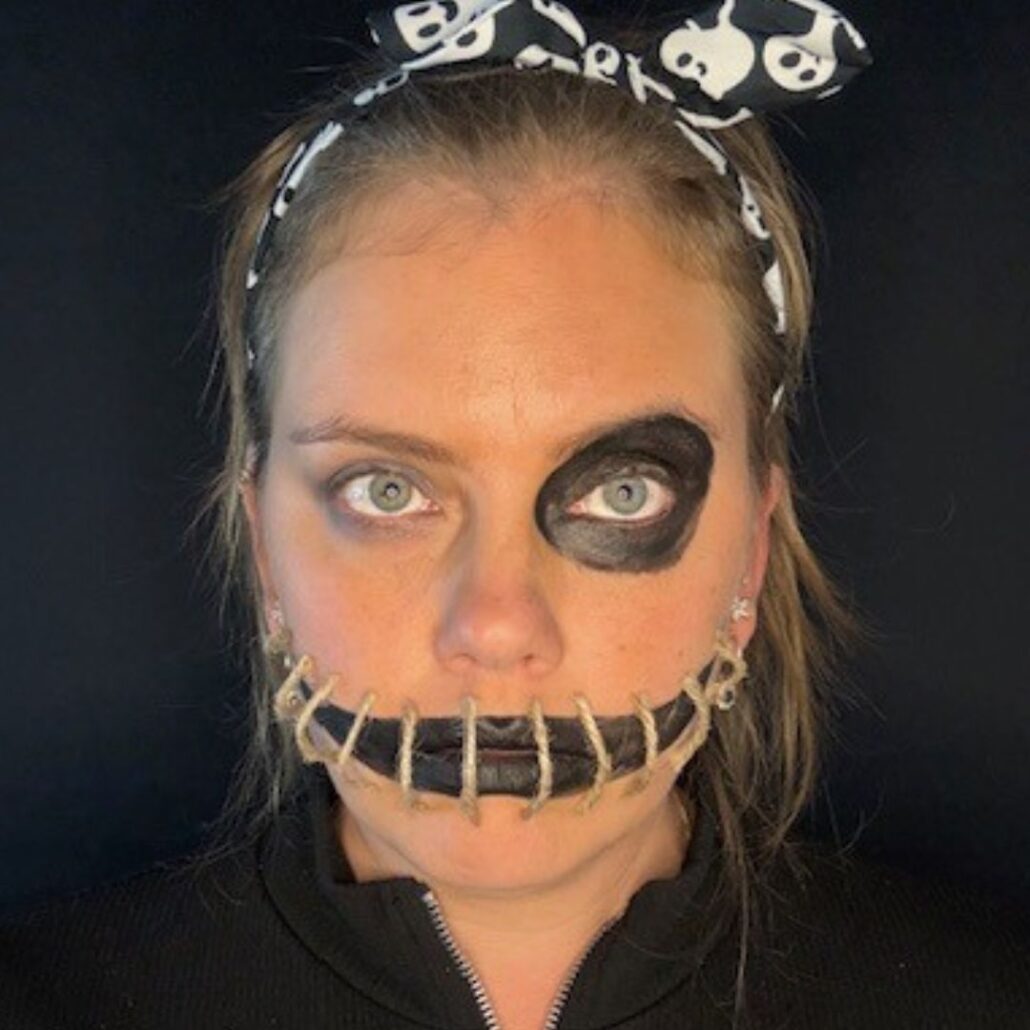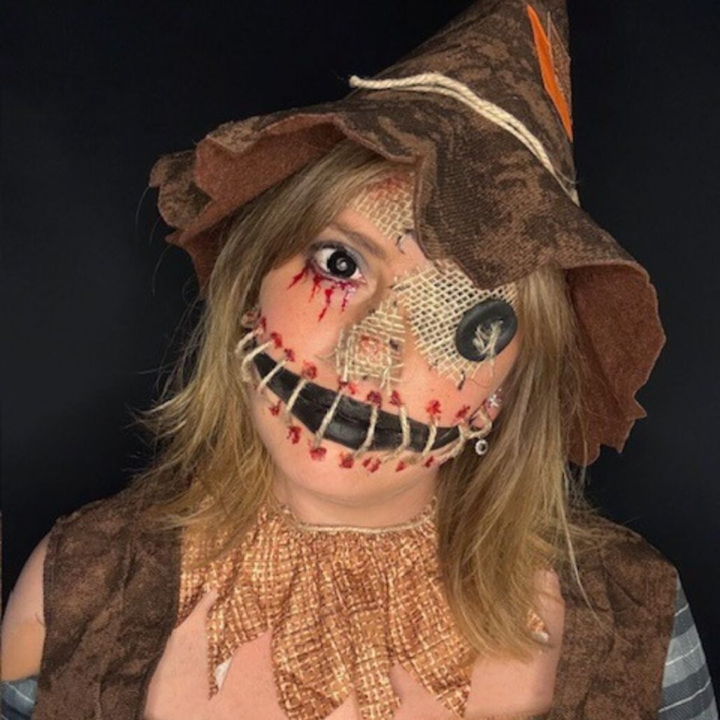 Het resultaat is een angstaanjagende vogelverschrikker met een dichtgestikte mond, bloederige details en een knoop-oog. Ideaal voor Halloween of elk griezelfeest. Durf jij deze look zelf te proberen?