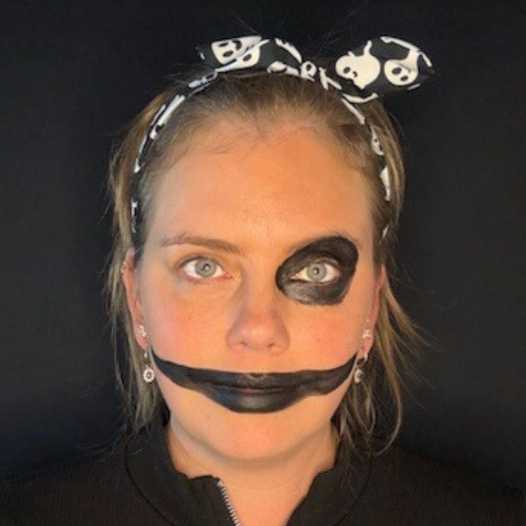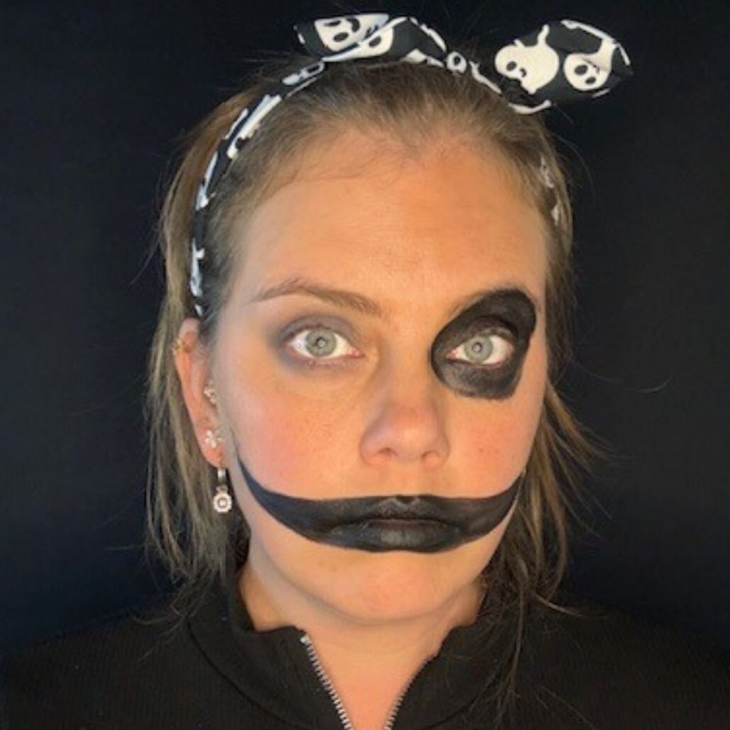 Teken met zwarte schmink de omlijning van je mond en kleur dit vlak helemaal in. Omlijn ook één oog en maak het andere oog extra donker met Mehron Starblend. Zo krijg je direct dat typische griezelige effect.